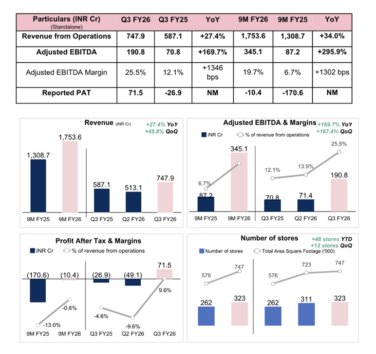 • First quarter of positive reported PAT; INR 71.5 crore in Q3FY26 vs. loss of INR 26.9 crore in Q3FY25